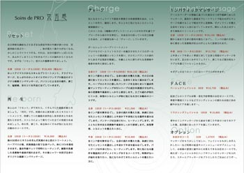 COMMENT//知り合いの方がされているプライベートサロンのパンフレット。グリーンをテーマカラーに清涼感や高級感、和になりすぎない和テイストをいれたメニューカタログにしました。 (イラストをクリックすると大きな画像が見られます。)