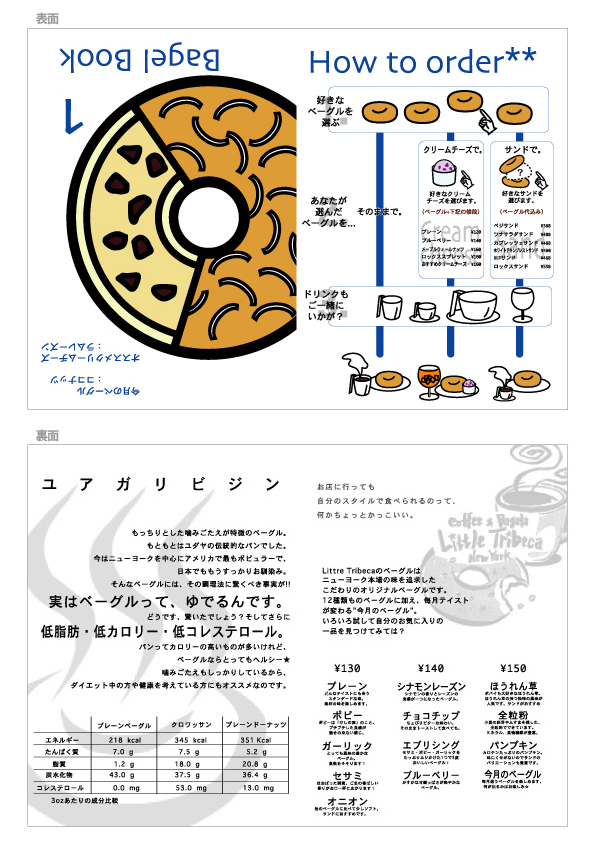 COMMENT// 「Little Tribeca 」というベーグルカフェで作成したパンフレット。 パンの種類、サンドする具材、セットのドリンクがそれぞれ選べる注文の流れを わかりやすくイラストで描きました。 Tribeca Bakeryの制作はこの1册のパンフレットから始まりました。