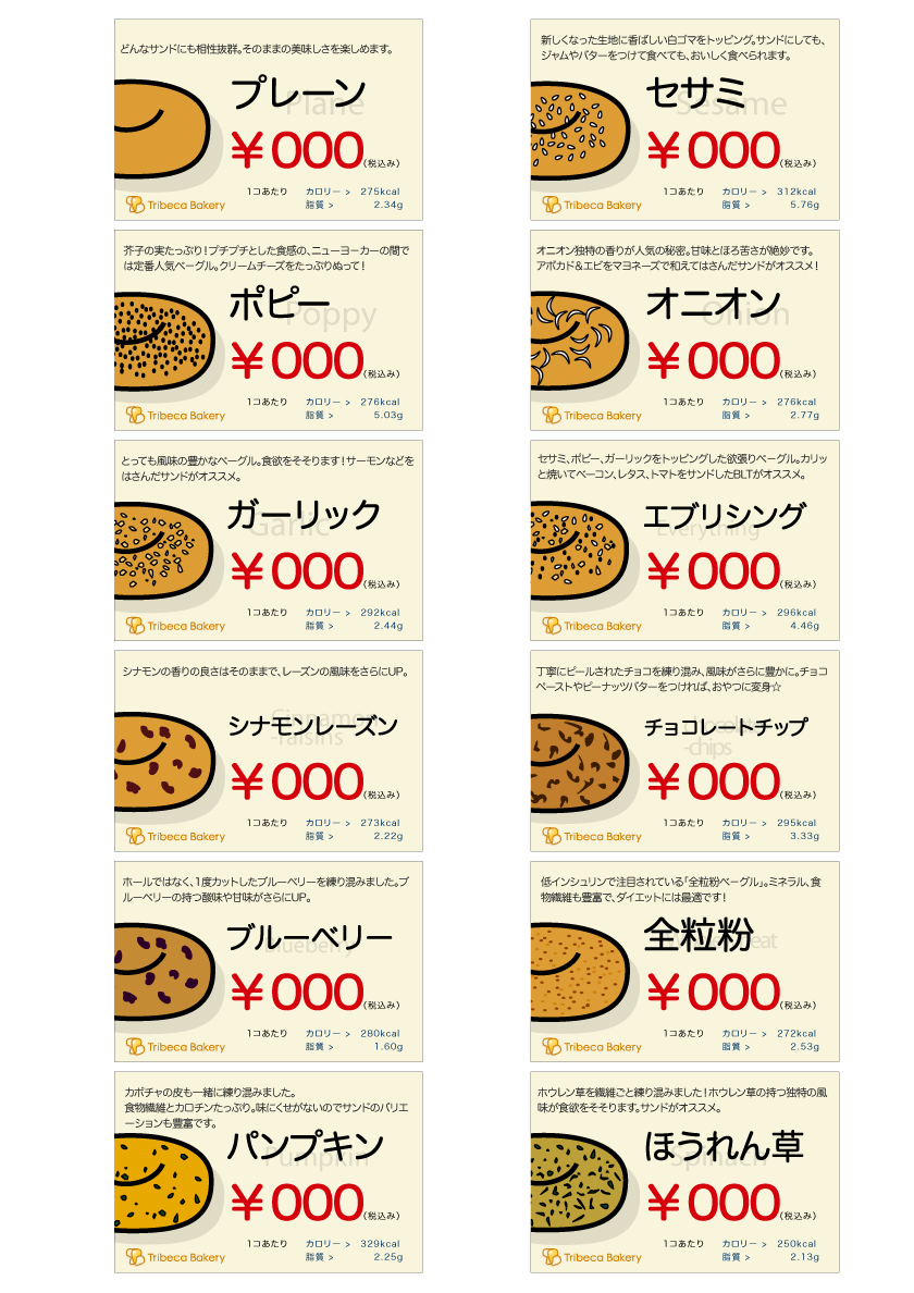 COMMENT//コンビニ、スーパー、デパ地下等用、プライスカード。 名前や価格だけでなく、ベーグルの種類ごとのイラストを描いたり、ベーグルの説明や特徴、美味しい食べ方のコメントを添えています。 さらに、ヘルシー志向のチェックポイント、「カロリー」「脂質」も表記。 新商品ごとに、ベーグルのイラストも新規で起こしています。