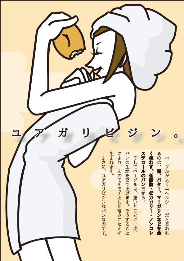 COMMENT// ベーグルはコレステロールゼロで低カロリーでヘルシーだということと、ベーグルの作り方で一度生地を茹でることから「湯上がり美人」なパン、ということをうたったポスターを作りました。